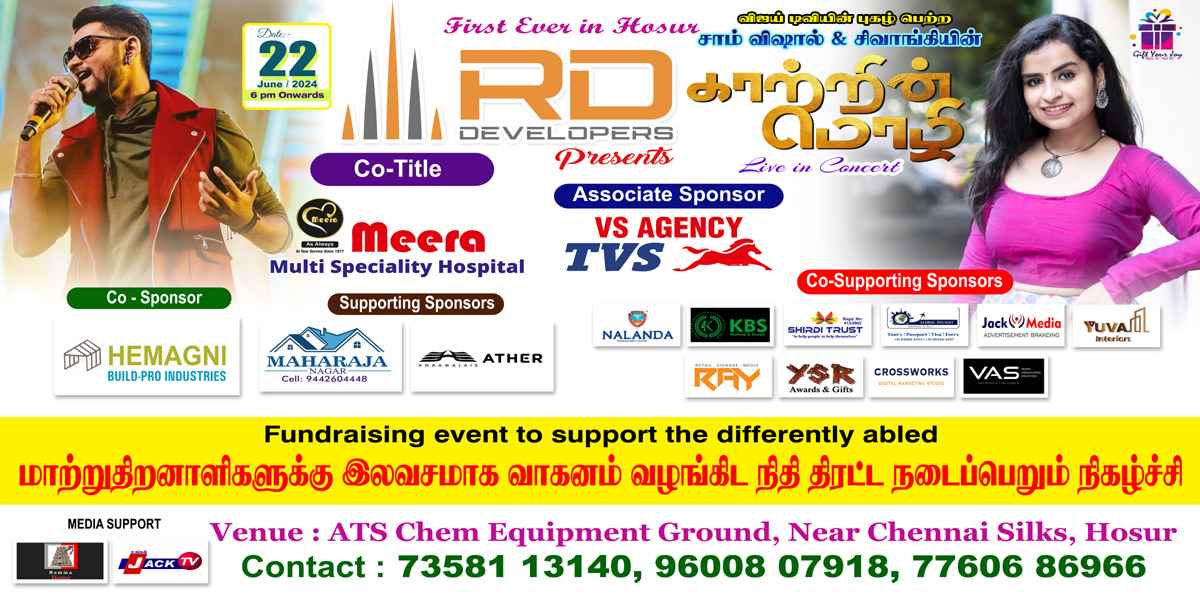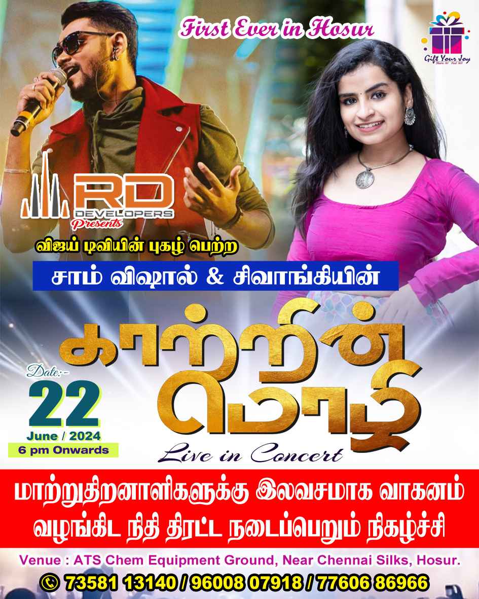Entry To The Cultural Program Is Free, While Entry To The Kaatrin Mozhi - Live In Concert & First Ever Sivaangi, Sam Vishal - Music Night In Hosur!